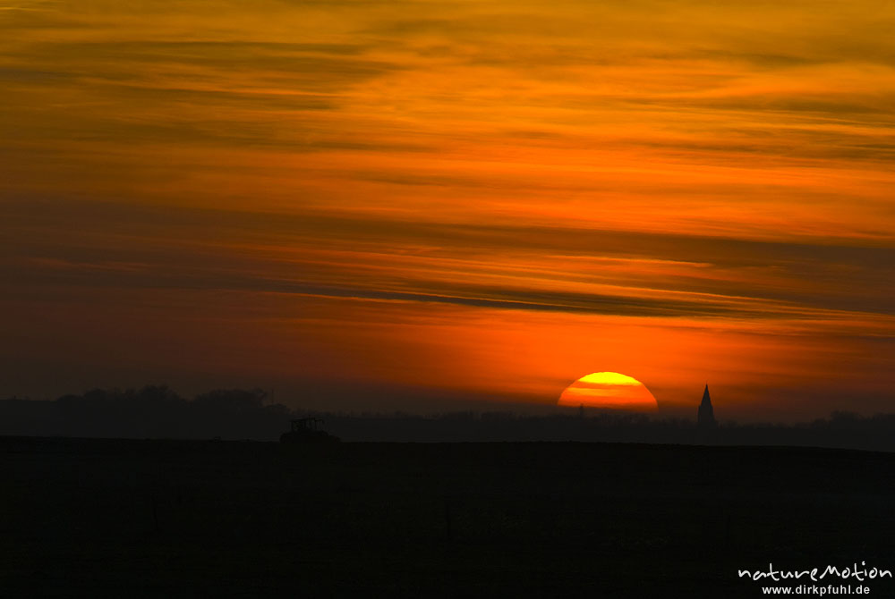 untergehende Sonne und Abendrot, Silhouette der Marienkirche von Barth, Traktor fährt im Vordergrund, Groß Mohrdorf, Deutschland