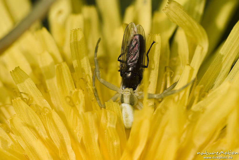 Veränderliche Krabbenspinne, Misumena vatia, Krabbenspinnen (Thomisidae), Weibchen in Löwenzahnblüte, mit Beute, Bad Karlshafen, Deutschland