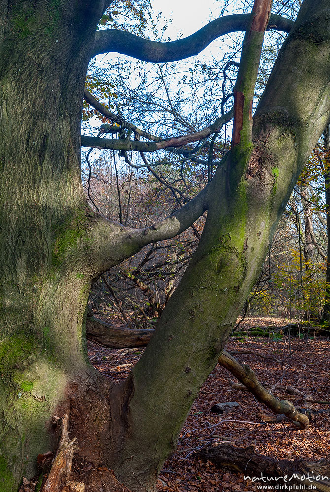 Verbindungsast zwischen zwei Buchenst?mmen, Zusammengewachsene Baumst?mme, Urwald Sababurg, Deutschland
