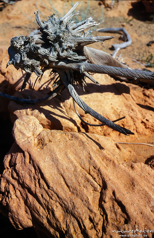 verdorrtes Holz auf roten Sandsteinfelsen Bayanzag, Mongolei