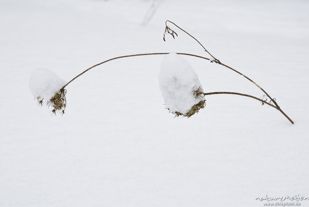 vertrocknete Doldenblüte mit Schneehaube, Kerstlingeröder Feld, Göttingen, Deutschland