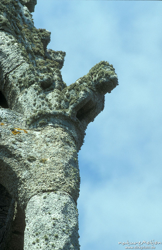 verwitterter Wasserspeier an Kirchturm, Bretagne, Frankreich