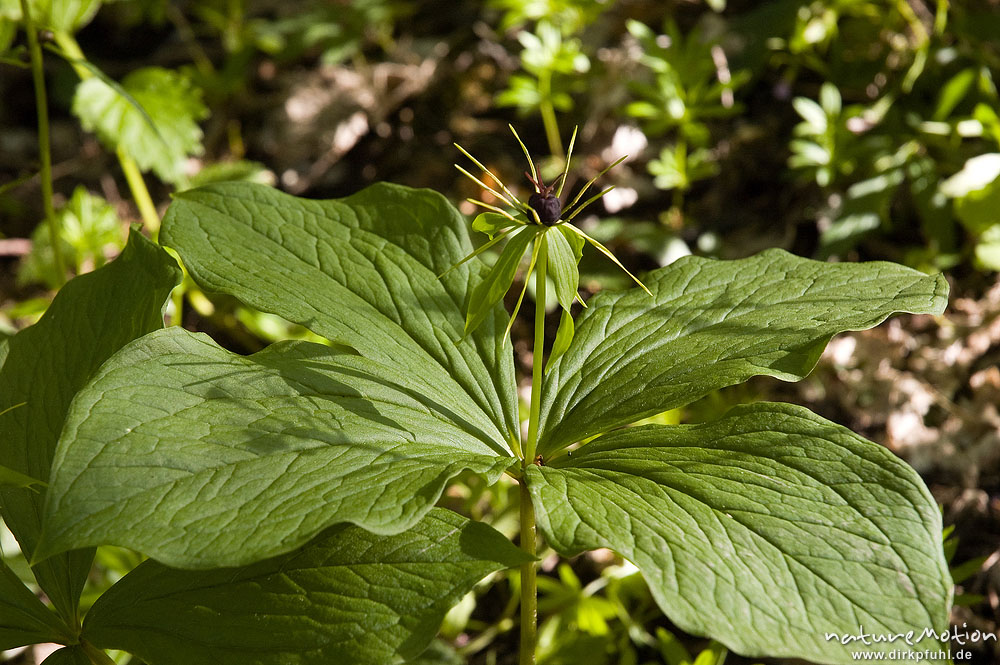 Vierblättrige Einbeere, Paris quadrifolia, Germergewächse (Melanthiaceae), Fruchtstand und Laubblätter, Ufer, Weisswassertal, Göttingen, Deutschland