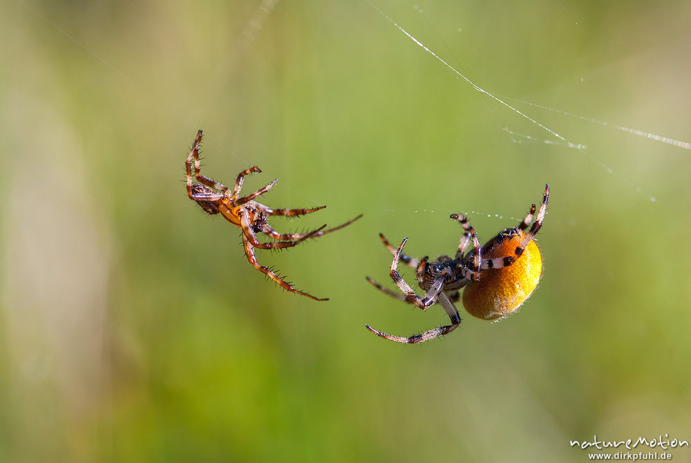 Vierfleck-Kreuzspinne, Araneus quadratus, Araneidae, Männchen und Weibchen, Männchen nähert sich vorsichtig, Paarungsversuch, A nature document - not arranged nor manipulated, Staffelsee, Deutschland