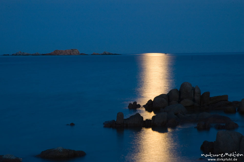 Vollmond über der Bucht von Palombaggia, Felsen und Lichtreflexe, Abenddämmerung, lange Belichtungsz, Korsika, Frankreich