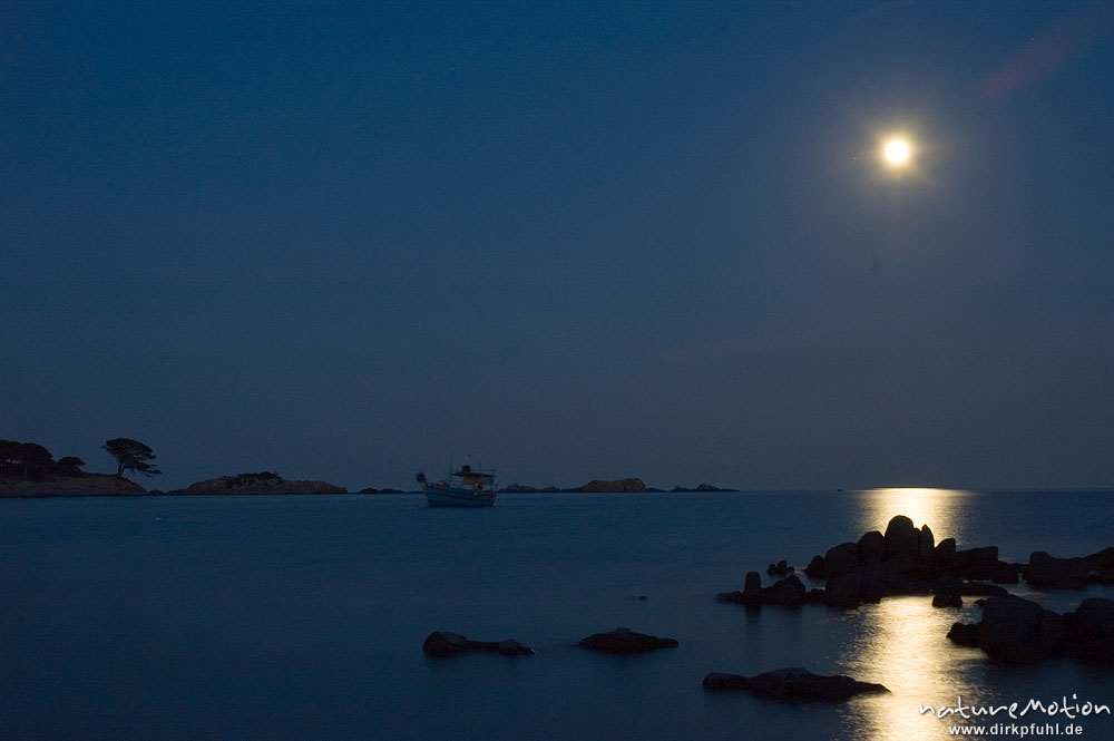 Vollmond über der Bucht von Palombaggia, Felsen und Lichtreflexe, Abenddämmerung, lange Belichtungszeit, Korsika, Frankreich