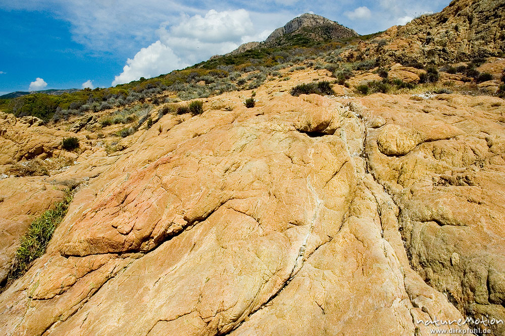 von der Brandung geschliffene Felsen, im Hintergrund Berggipfel, Plage d'Arone Korsika, Frankreich