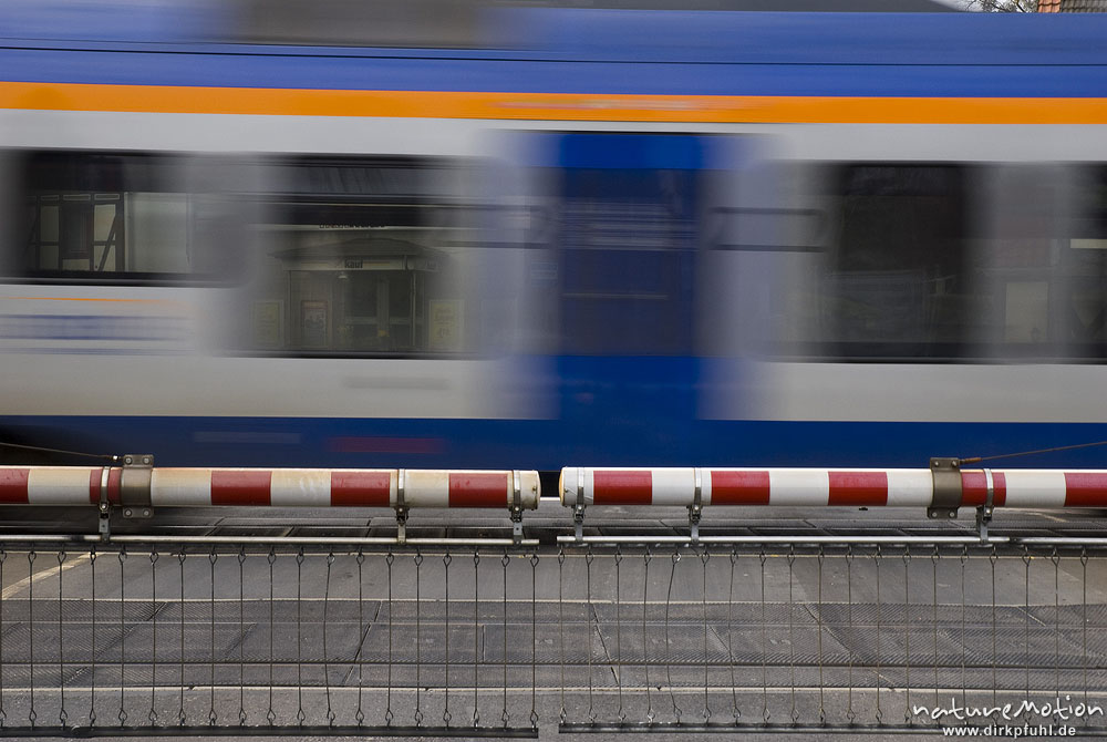 vorbeifahrender Zug, davor geschlossene Schranken eines Bahnübergangs, Cantus, Bahnübergang Friedland, Friedland, Deutschland