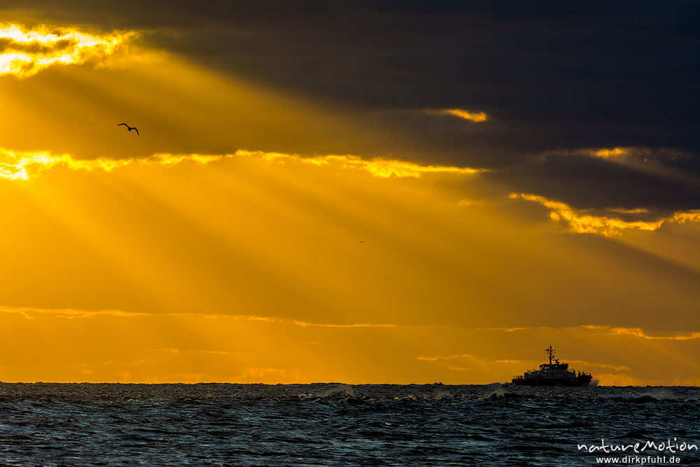 vorbeifahrendes Schiff, Sonnenuntergang über dem Meer, Hohes Riff, Borkum, Deutschland