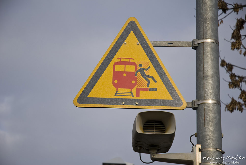 Vorsicht Bahnsteigkante, Schild am Bahnsteig, Bahnhof Friedland Friedland, Deutschland