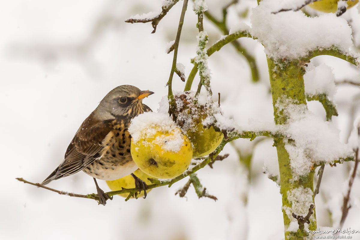 Wacholderdrossel, Turdus pilaris, Drosseln (Turdidae), Tier frisst an hängen gebliebenem Apfel, Schnee, Göttingen, Deutschland