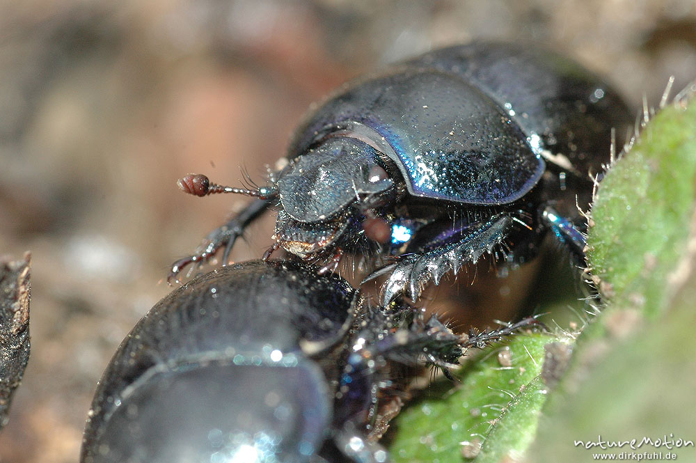 Waldmistkäfer, Anoplotrupes stercorosus, zwei Käfer, Detailansicht Kopf, vielleicht beim Vorspiel zur Paarung, Wald bei Ossenfeld, Ossenfeld (Göttingen), Deutschland