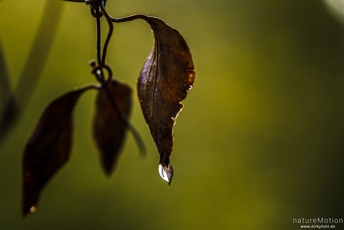 Waldrebe, Clematis vitalba, Ranunculaceae, vertrocknetes Herbstblatt mit Wassertropfen, Göttingen, Deutschland