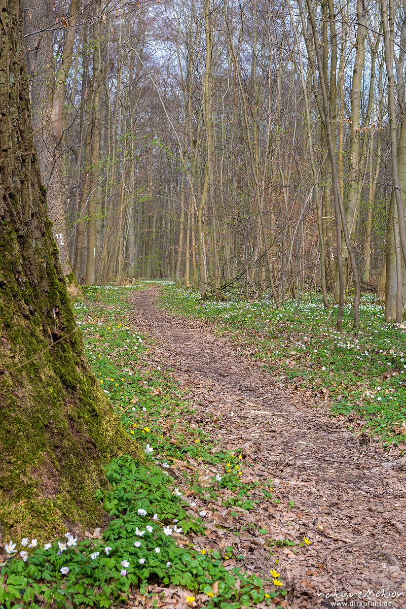 Waldweg im Frühling, Waldboden bedeckt mit Buschwindröschen und anderen Frühblühern, Frühjahrs Geophyten, Kehr, Göttingen, Deutschland