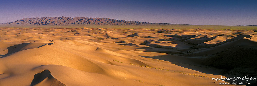 Wanderdünen, am Horizont flacher Gebirgsrücken, Chongorin Els, Mongolei