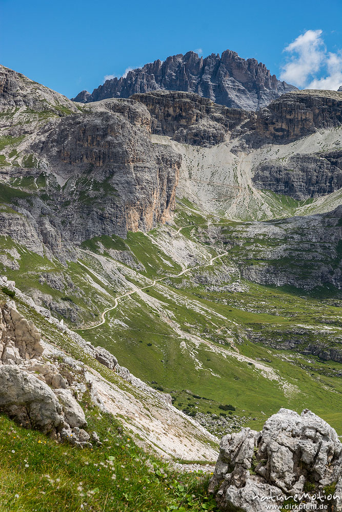 Wanderweg zur Büllelejochhütte, Blick auf den Elferkofel, Dolomiten, Italien