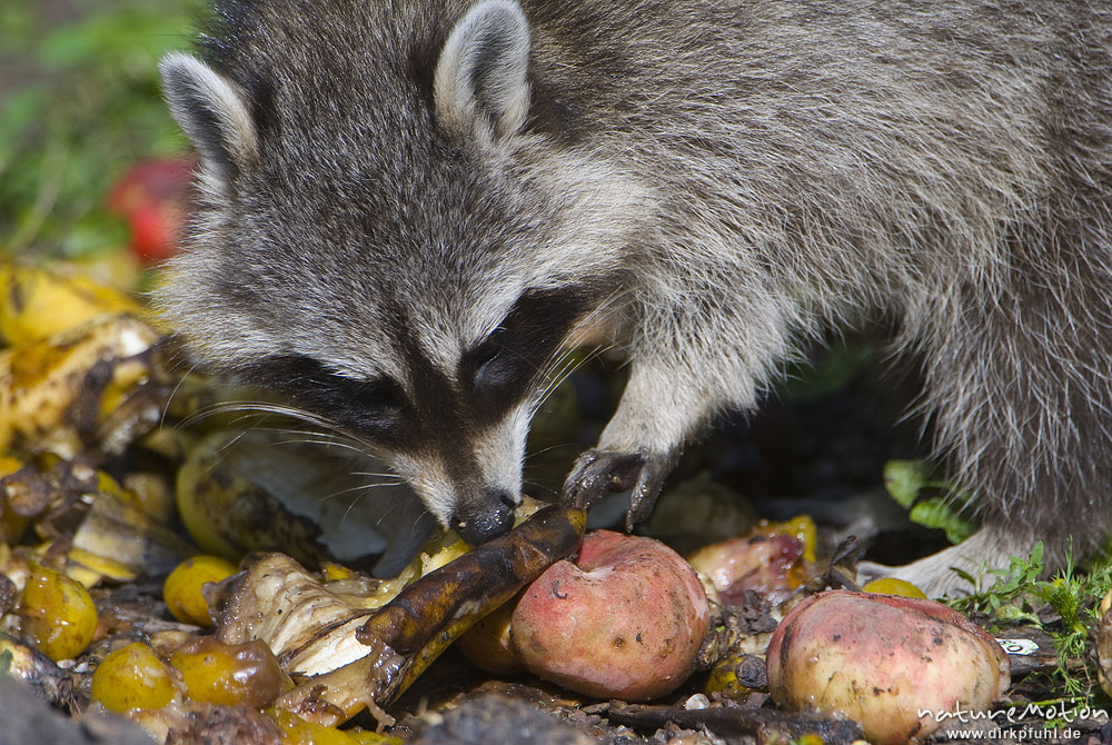 Waschbär, Procyon lotor, Procyonidae, beim fressen, Gehege, Tierpark Neuhaus, captive, Neuhaus, Deutschland