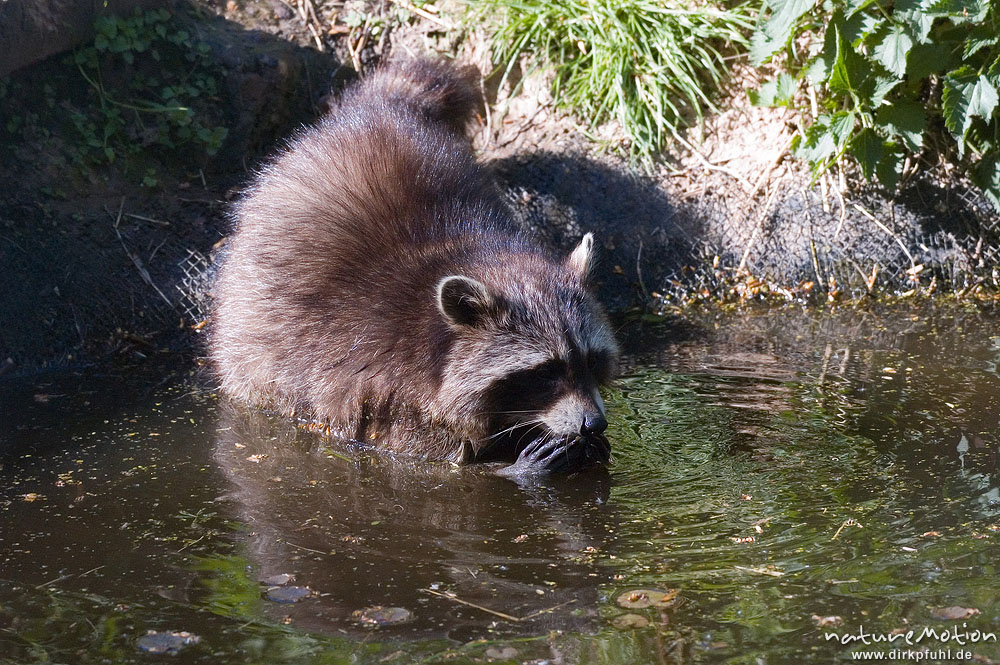 Waschbär, Procyon lotor, Procyonidae, beim waschen der Nahrung in einem Teich, Bärenpark Worbis, Deutschland