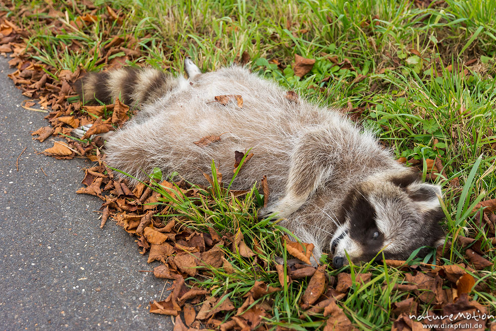 Waschbär, Procyon lotor, Procyonidae, totes Tier am Wegrand, Göttingen, Deutschland