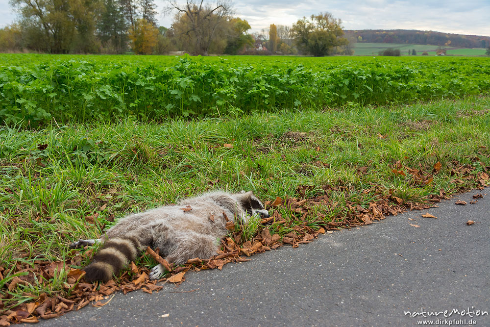 Waschbär, Procyon lotor, Procyonidae, totes Tier am Wegrand, Göttingen, Deutschland