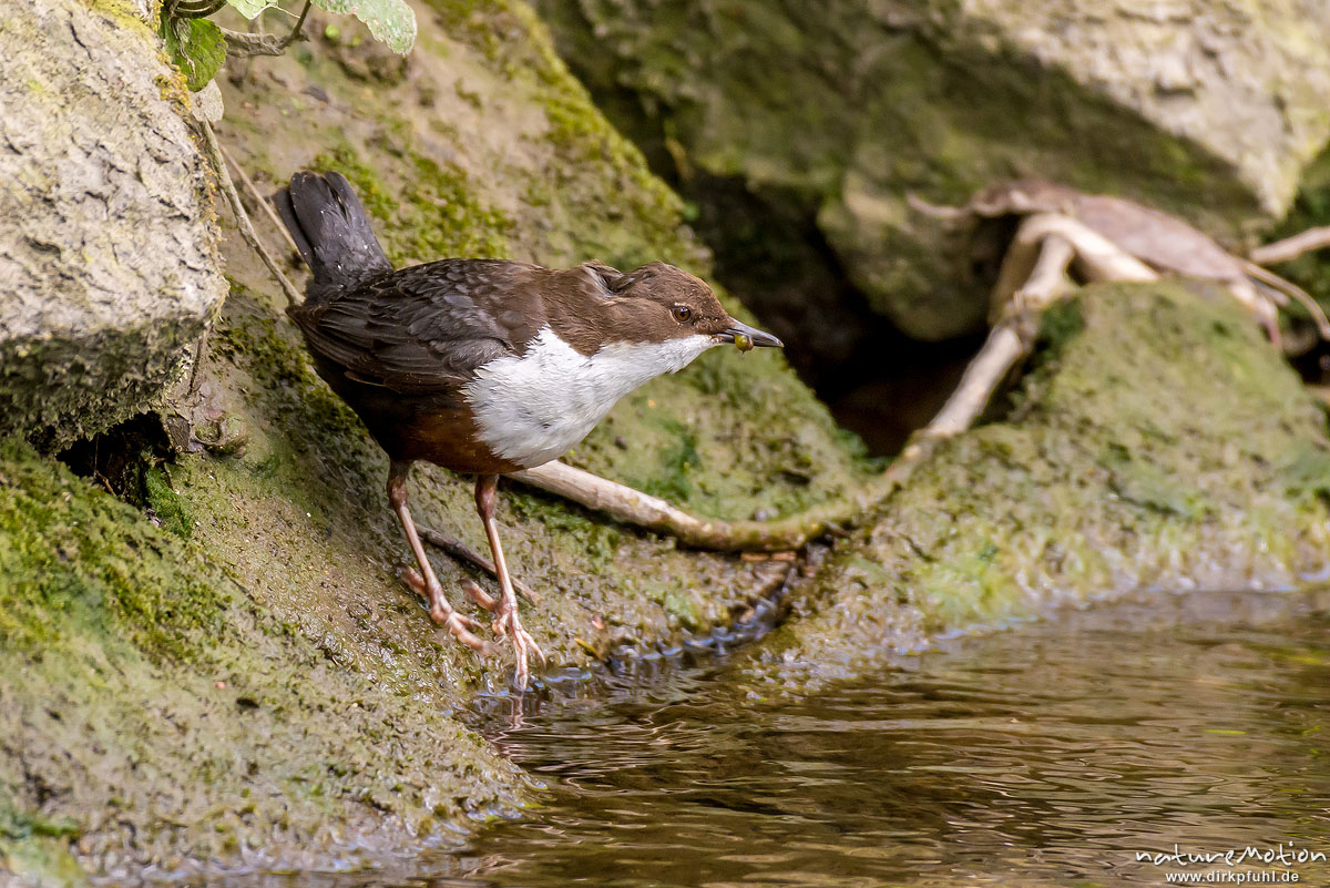 Wasseramsel, Cinclus cinclus, Wasseramseln (Cinclidae), Tier mit Beute (Köcherfliegenlarve) iam Ufer der Grone, Levinscher Park, Göttingen, Deutschland