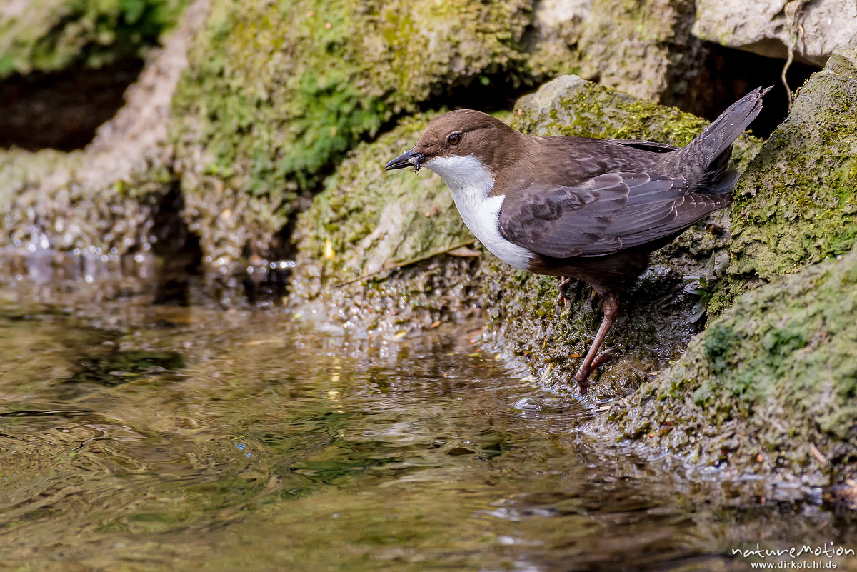 Wasseramsel, Cinclus cinclus, Wasseramseln (Cinclidae), Tier mit Beute (Köcherfliegenlarve) iam Ufer der Grone, Levinscher Park, Göttingen, Deutschland