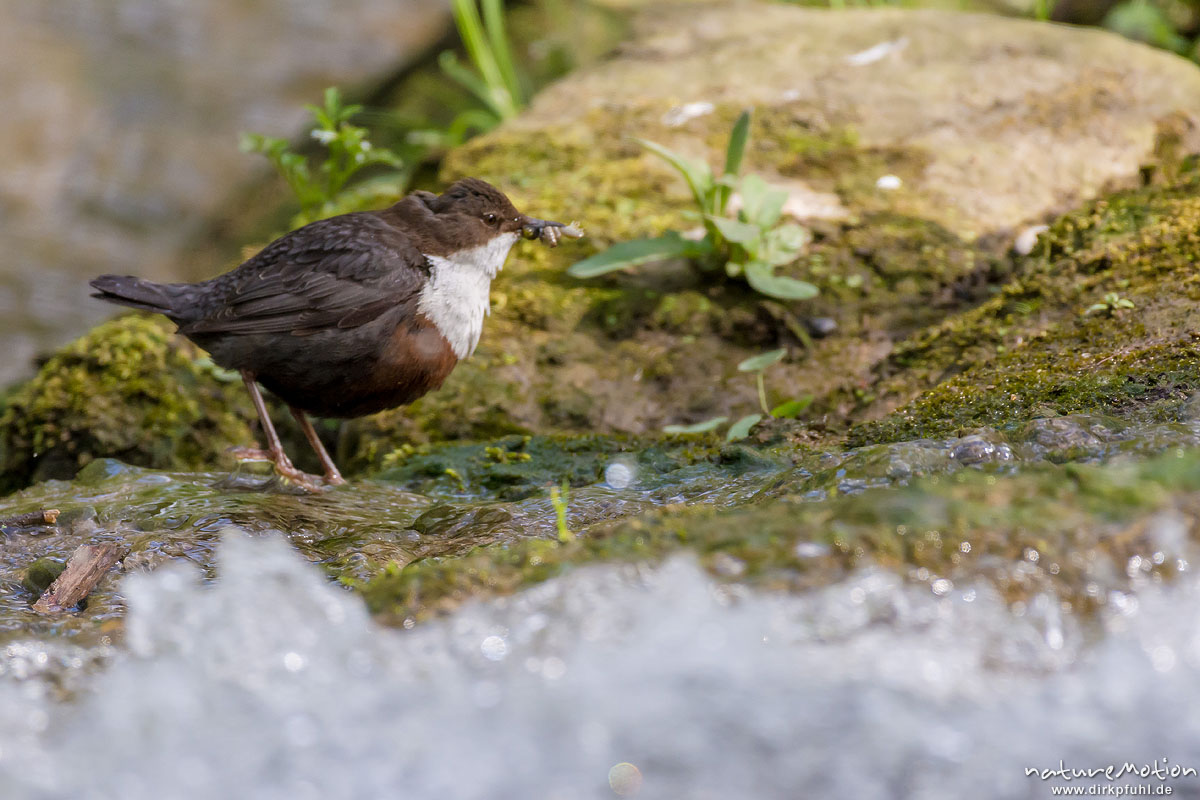 Wasseramsel, Cinclus cinclus, Wasseramseln (Cinclidae), Tier mit Beute (Köcherfliegenlarve) iam Ufer der Grone, Levinscher Park, Göttingen, Deutschland