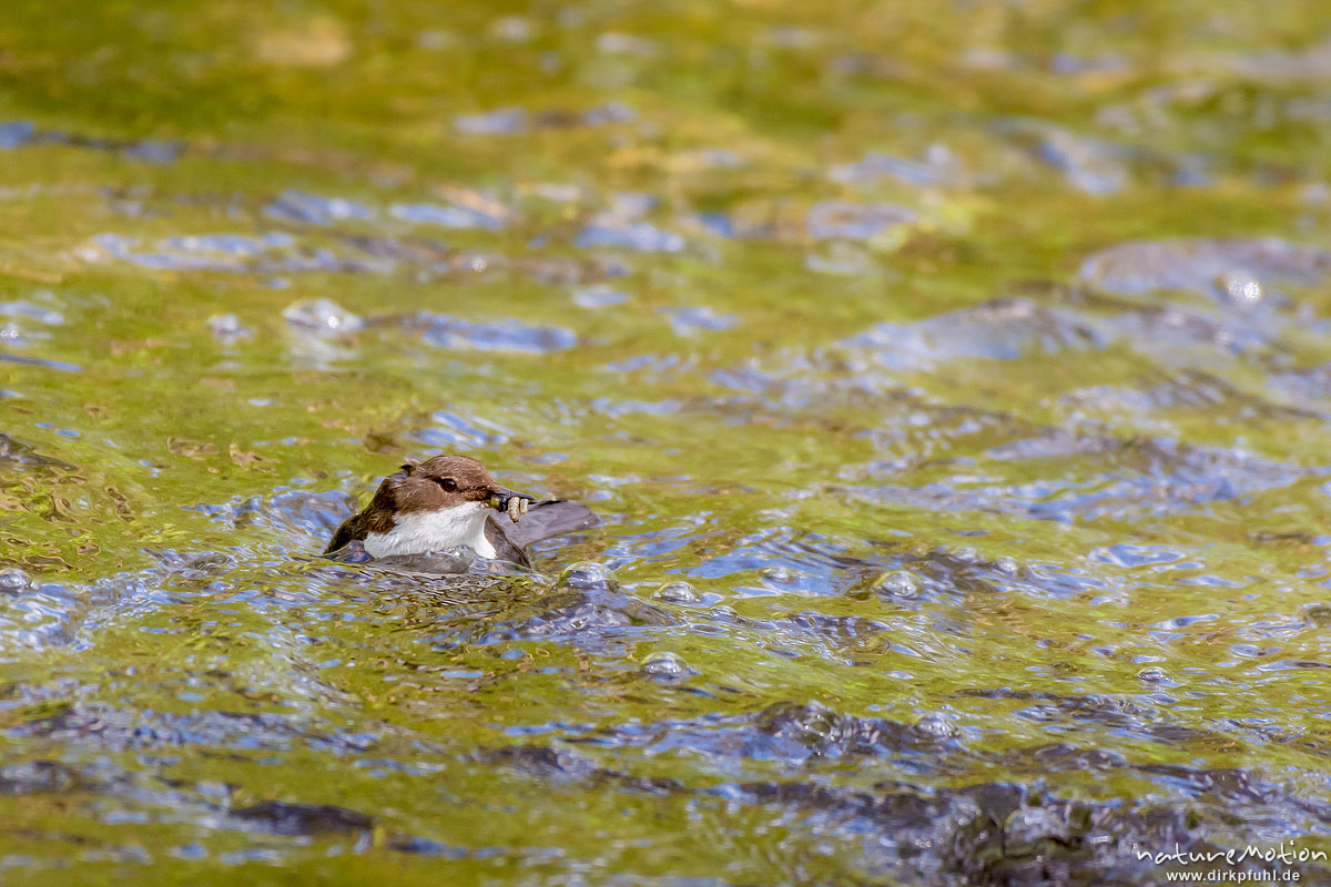 Wasseramsel, Cinclus cinclus, Wasseramseln (Cinclidae), Tier mit Beute (Köcherfliegenlarve) im Wasser der Grone, Levinscher Park, Göttingen, Deutschland