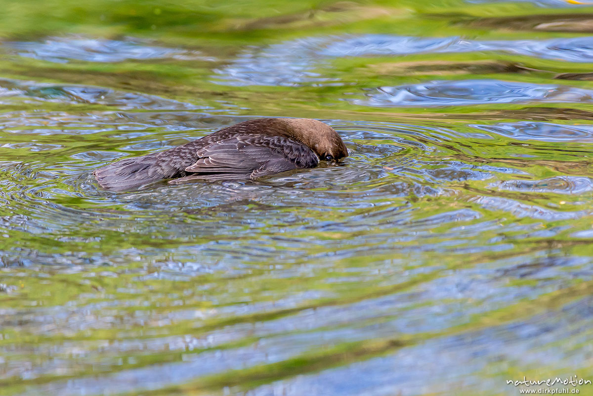 Wasseramsel, Cinclus cinclus, Wasseramseln (Cinclidae), Tier taucht nach Beute im Wasser der Grone, Levinscher Park, Göttingen, Deutschland