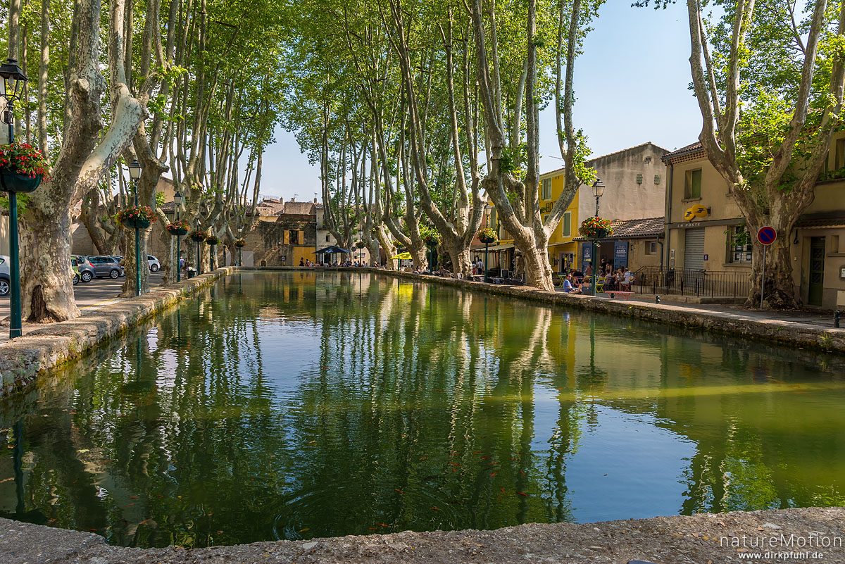 Wasserbecken gesäumt von großen Platanen, Dorfplatz, Cucuron - Provence, Frankreich