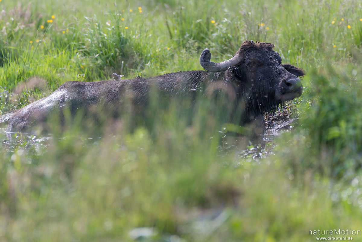 Wasserbüffel, Bubalus arnee, Hornträger (Bovidae), Tier in Suhle, Wasserbüffel-Weide Wurzacher Ried, Bad Wurzach, Deutschland