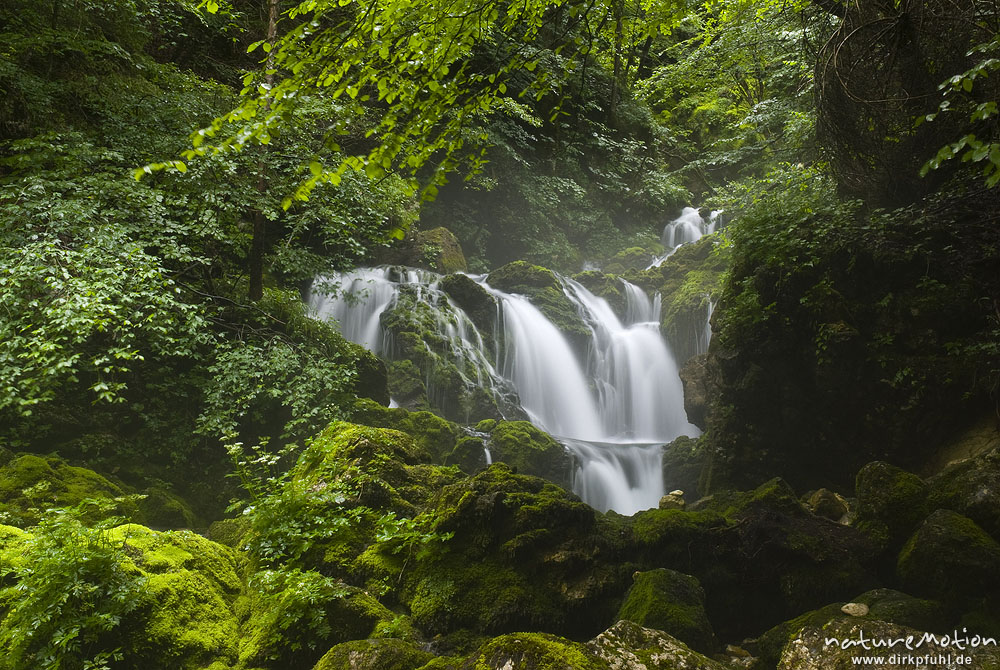 Wasserfall der Mosnica, Regen und Nebelstimmung, Planinska Vojah Alm Triglav-Nationalpark, Slowenien