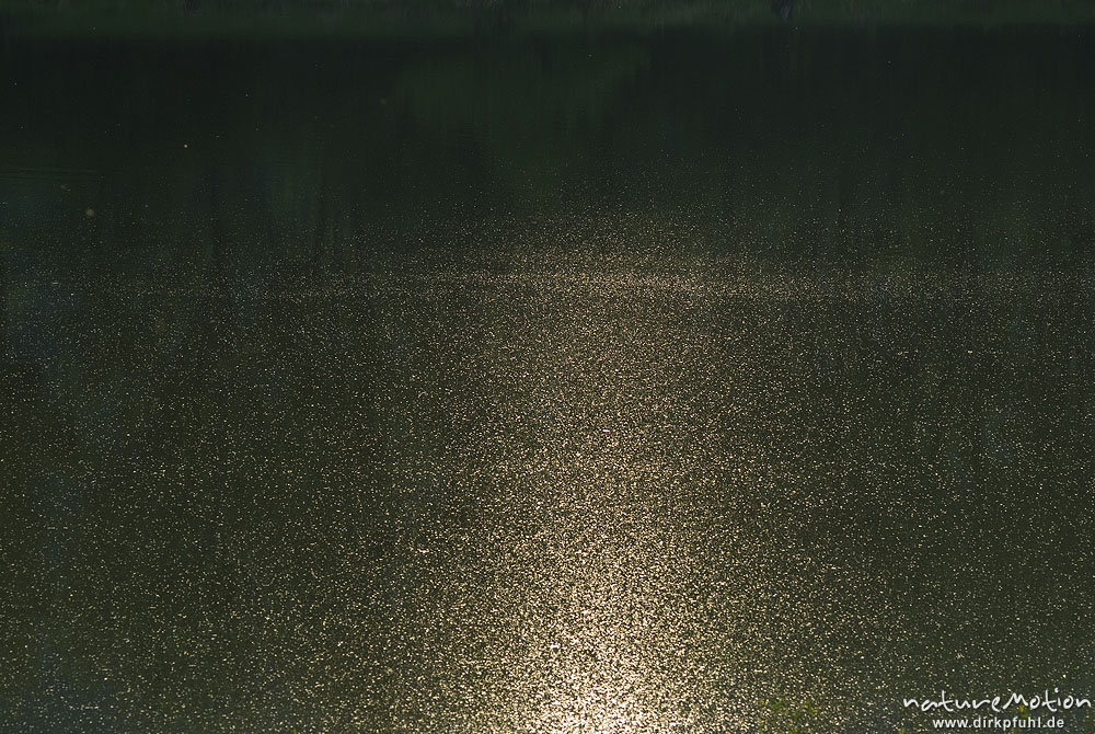 Wasseroberfläche von Pollenkörnern bedeckt, Lichtstreifen der untergehenden Sonne, Axelsee, Würgassen, Deutschland