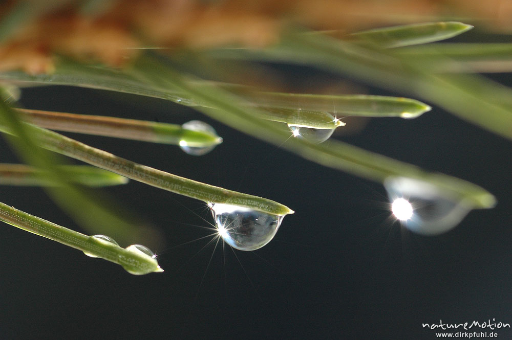 Wassertropfen an Fichtennadel, getauter Schnee, Sonnenglitzern, Achtermann Harz, Deutschland