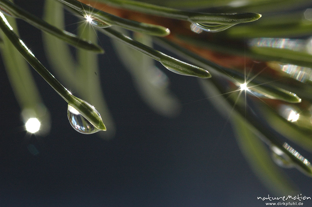 Wassertropfen an Fichtennadel, getauter Schnee, Sonnenglitzern, Achtermann Harz, Deutschland