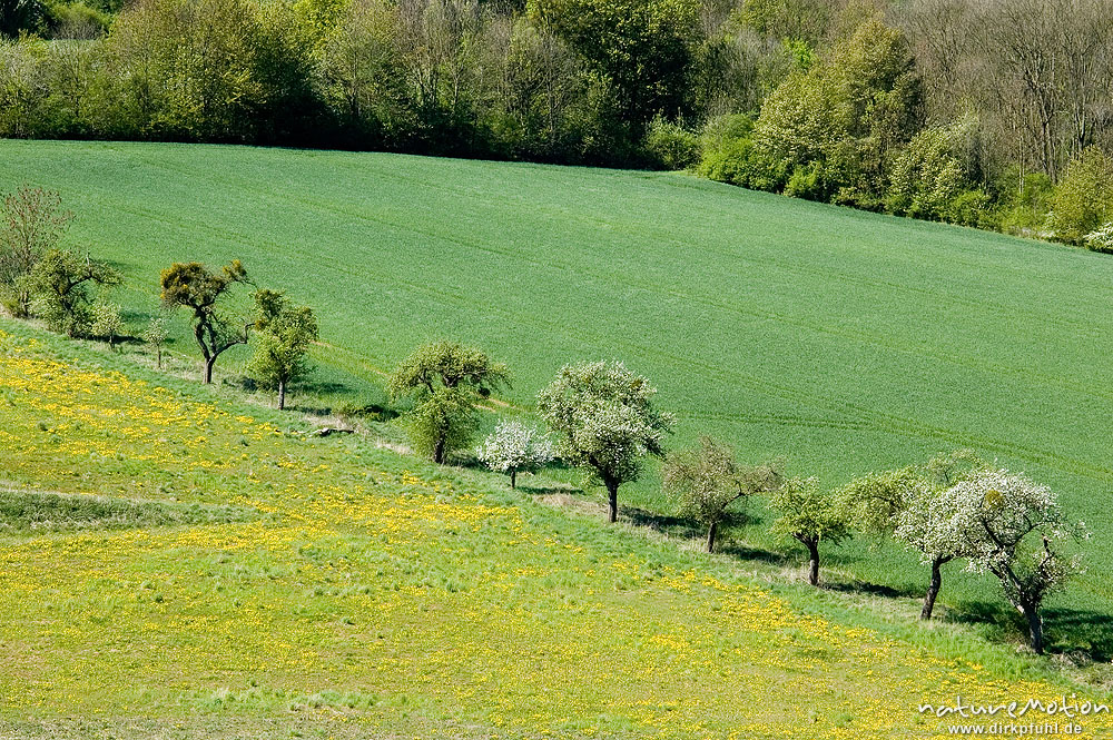 Weg mit Baumreihe zwischen Feld und Löwenzahn-Wiese, Herberhausen Göttingen, Deutschland