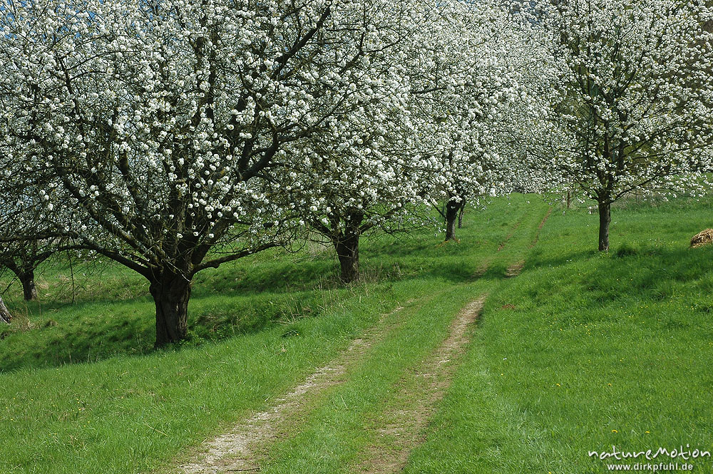 Weg zwischen blühenden Kirschbäumen, Kirschplantagen bei Witzenhausen Witzenhausen, Deutschland