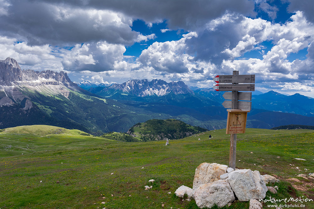 Wegweiser am Schlernhaus, Rosengarten und Latemar, Dolomiten, Seiseralm (S?dtirol), Italien