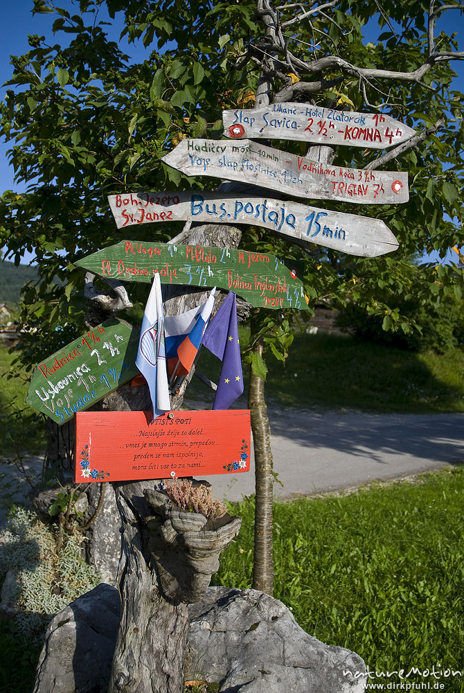 Wegweiser bei Stara Fuzina, Bohinjer See Wocheiner See, Slowenien