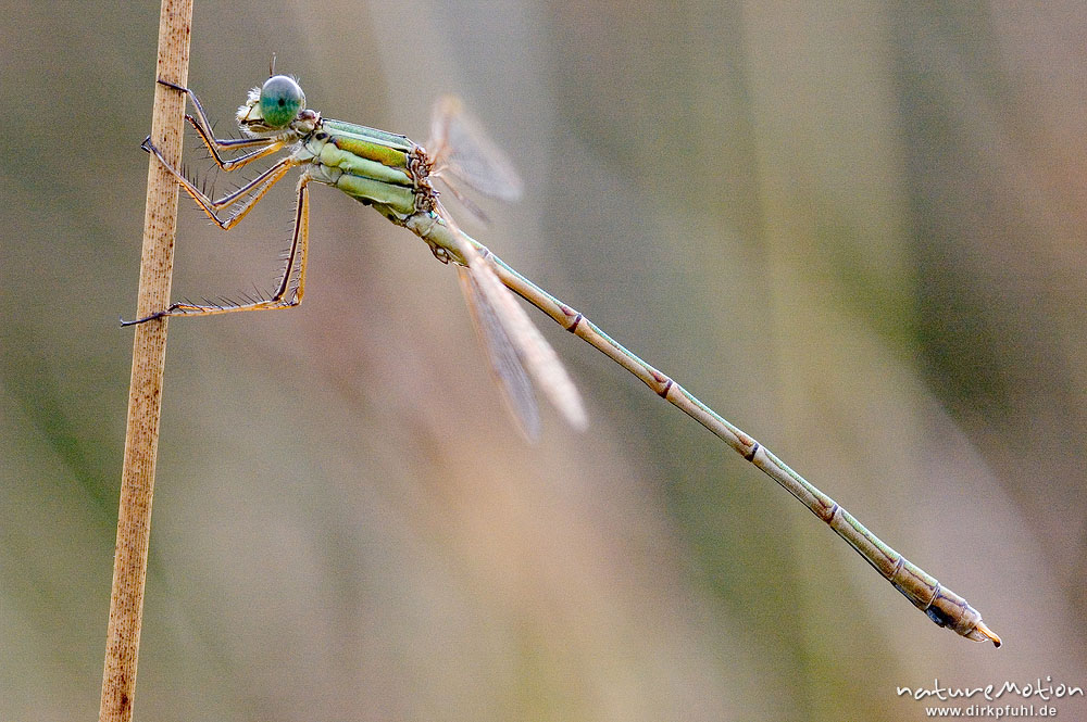 Weidenjungfer, Lestes viridis, Lestidae, Männchen an Binsenhalm, Tripkenkuhle Göttingen, Deutschland