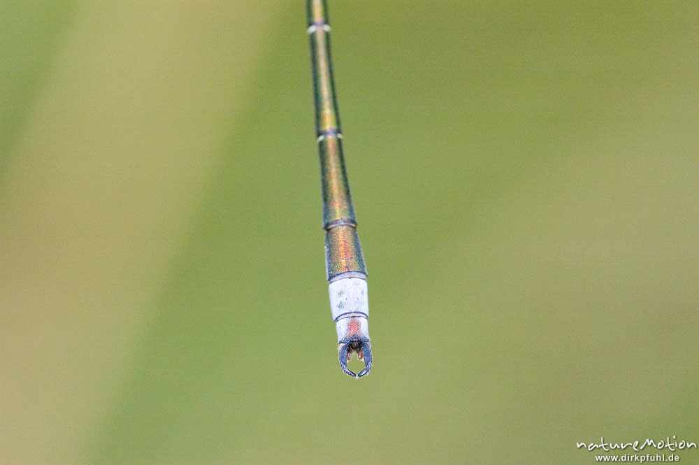 Weidenjungfer, Lestes viridis, Lestidae, Männchen Hinterleibsanhänge (Bestimmungsmerkmal), Göttingen, Deutschland