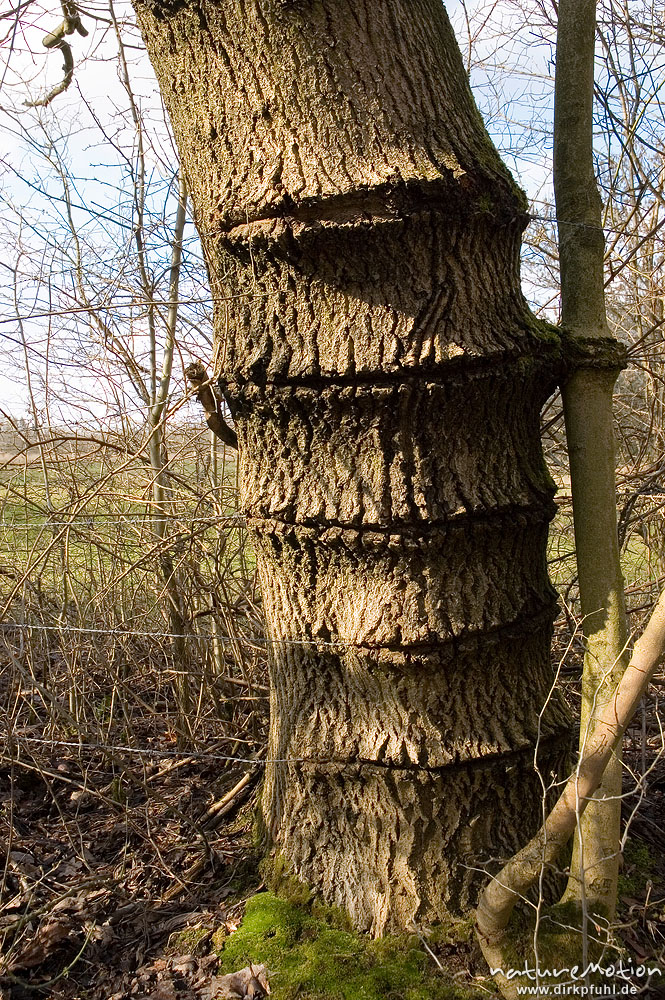 Weidezaun, Stacheldraht ist tief in die Borke einer Esche eingewachsen, Göttingen, Deutschland