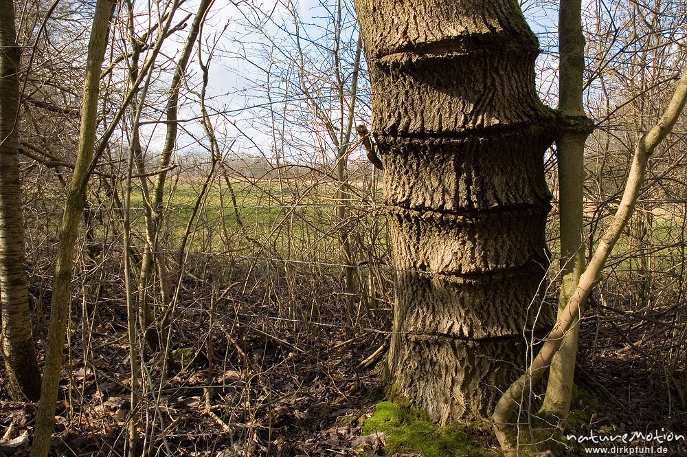 Weidezaun, Stacheldraht ist tief in die Borke einer Esche eingewachsen, Göttingen, Deutschland