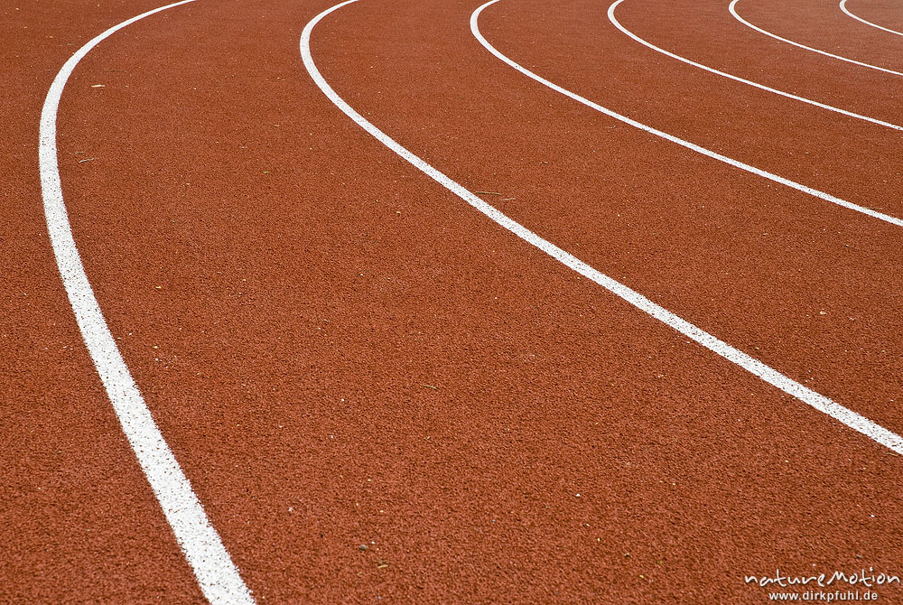 weiße Markierungen der Laufbahn, Stadionkurve, Leichtathletik, Jahnstadion Göttingen, Deutschland