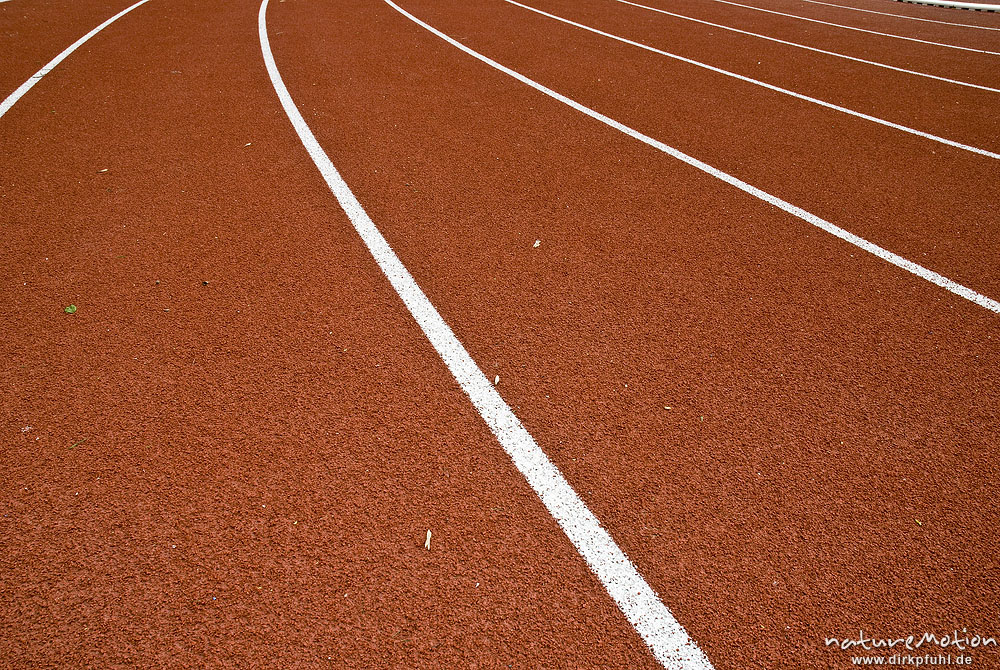 weiße Markierungen der Laufbahn, Stadionkurve, Leichtathletik, Jahnstadion Göttingen, Deutschland