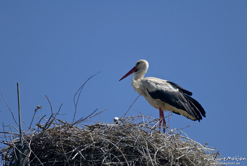 Weißstorch, Ciconia ciconia, Störche (Ciconiidae), Altvogel auf Nest, mehrere Jungvögel, Nest auf Hausdach, Wussegel, Wendland, Deutschland
