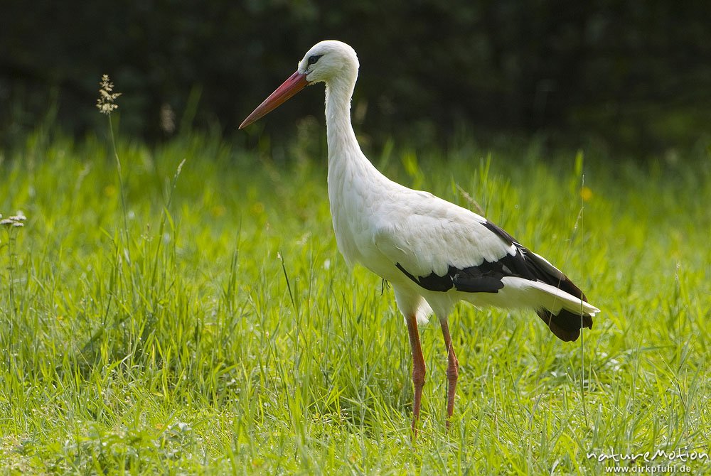 Weißstorch, Ciconia ciconia, Störche (Ciconiidae), Tier auf Wiese, Gehege, Tierpark Sababurg, captive, Sababurg, Deutschland