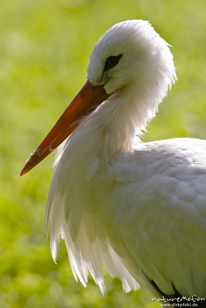 Weißstorch, Ciconia ciconia, Störche (Ciconiidae), Tier auf Wiese, Teilansicht Kopf, Schnabel ruht im aufgestellten Brustgefieder, Gegenlicht, Gefiederzeichnung, Gehege, Tierpark Sababurg, captive, Sababurg, Deutschland