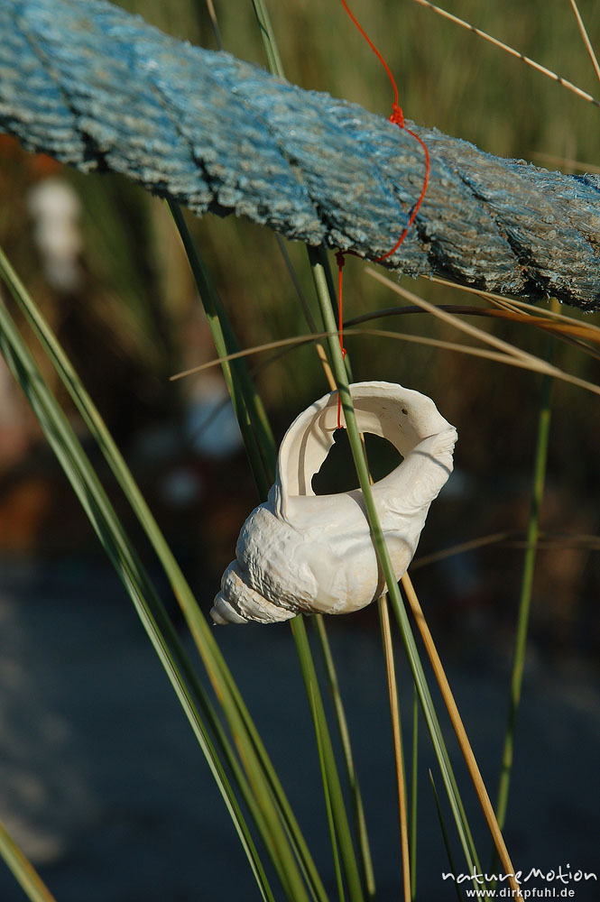 Wellhornschnecke, Buccinum undatum, Buccinidae, Gehäuse als Teil von Kunstwerk aus Treibgut, Amrum Amrum, Deutschland