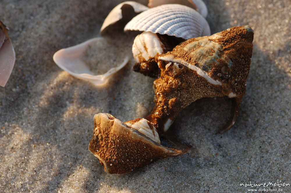 Wellhornschnecke, Buccinum undatum, Buccinidae, Wellhornschneckenhaus und Herzmuschelschale im Sand, Amrum, Amrum, Deutschland